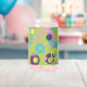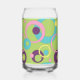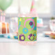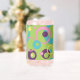 A bright green background is adorned with a funky pattern of circles, dots, and rings in a variety of vibrant colours, including pink, blue, purple, and yellow. This glassware is also available in rocks and stemless wineglass styles.
