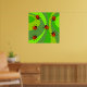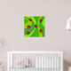 Funky cartoon red ladybugs scuttling around against a retro green swirly background design.