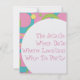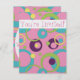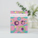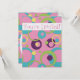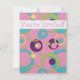 A bright pink background is adorned with a funky pattern of circles, dots, and rings in a variety of vibrant colours, including blue, green, purple, and yellow.