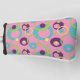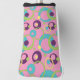 A bright pink background is adorned with a funky pattern of circles, dots, and rings in a variety of vibrant colours, including blue, green, purple, and yellow.