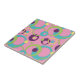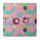 A bright pink background is adorned with a funky pattern of circles, dots, and rings in a variety of vibrant colours, including blue, green, purple, and yellow. This tile can be framed to create a trivet or placed inside a wooden gift box lid. Tiles without a frame will also fit inside the large gift box to create a matching set.