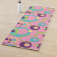 A bright pink background is adorned with a funky pattern of circles, dots, and rings in a variety of vibrant colours, including blue, green, purple, and yellow.