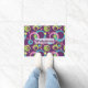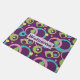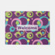 A vibrant purple background is adorned with a funky pattern of circles, dots, and rings in a variety of bright colours, including pink, green, blue, and yellow.