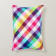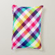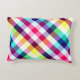 An accent pillow featuring a colourful plaid pattern design in rainbow colours.