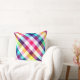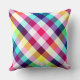 A 20” x 20” throw pillow featuring a colourful plaid pattern design in rainbow colours.