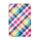 A medium sized bath mat featuring a colourful plaid pattern design in rainbow colours.