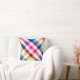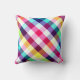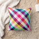 A 16” x16” throw pillow featuring a colourful plaid pattern design in rainbow colours.