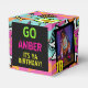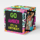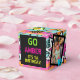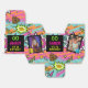 Front: Go {NAME} It's Ya Birthday! All Over Neon Pink-Green-Blue and Yellow retro pattern with two photo frames (on both sides)for the guest of honour photos