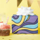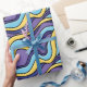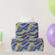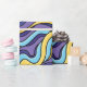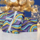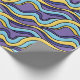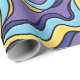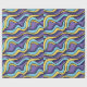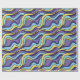 Colourful waves wrapping paper with a pattern featuring seamlessly tiled funky abstract waves in yellow, blue and purple colours. This fun trippy geometric design is drawn in a retro modern style.
