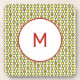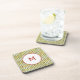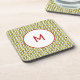This monogrammed coaster is decorated with a cool retro style pattern in olive green with bead-like oblong shapes set at intervals along straight vertical lines. Each colour may be edited in this special graphic for a custom look.