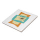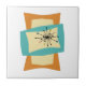 This funky mid century modern ceramic tile features squeezed and stretched rectangle shapes in the colours turquoise blue, cream, and orange. Starburst accents in pink, blue, gold, and black highlight the design. Add that funky retro accent to your tiling project!