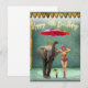 Fun and funky altered art 40th birthday vignette features vintage party girl in swimsuit and a parasol carrying elephant photo cutouts with neon text
