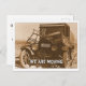 Adapted from an old vintage photograph of a truck that belonged to a migrant family from Texas going west to flee the dust bowl in 1930's America with all their earthly possessions strapped to the outside of the vehicle. I converted this image from straight black and white to an enhanced sepia look. The text says: We are moving in a clunky junky font and on the back is a new address template for you to change to your own.
