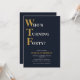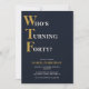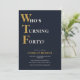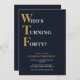 Celebrate your 40th birthday in style and with humour! On a navy blue background, the gold and off white typography at the top reads "Who's Turning Forty?" with the WTF larger and in gold. Underneath, you can customise the white and gold typography with your own details. Unique, cheeky and perfect for the big birthday celebrations!
