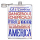 This funny flask is perfect for carrying to your 4th of July festivities. In red and blue typography, it says, "Let's Combine Dangerous Chemicals, Fire & Beer in Celebration of America." The background has a light fireworks pattern.