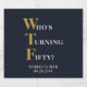 Celebrate your 50th birthday in style and with humour! On a navy blue background, the gold and off white typography reads "Who's Turning Fifty?" with the WTF larger and in gold. Underneath, you can customise the name and date of the birthday, or simply delete the template message and add your own. Unique, cheeky and perfect for the big birthday celebrations!
