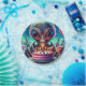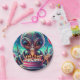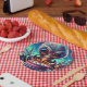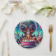 Alien themed birthday party paper plates. An extraterrestrial eating cake with a birthday hat on.