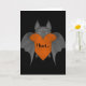 A cute card with a goth funny silly vampire bat holding a big orange heart that reads "I want" on the front, and "You" inside. The rest of the text reads "for Halloween, any questions?". All the wording can easily be changed by you.