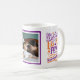 Add your own photo to personalise this modern Mother's Day mug which features two popular expressions for moms in trending typography, colours purple and orange. Quotes read: Mothers hold their child's hands for a moment and their heart for a lifetime. A mother is like a flower, each one is beautiful and unique.