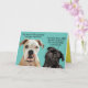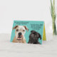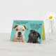 These two dogs (an American Bulldog and a Black Pug) are discussing why all the humans are wearing muzzles (aka: masks). Their answer? Must be because humans haven't learned the sit and stay commands yet. Funny and cute card to bring a smile to everyone who's been wearing the mask and sheltering in place during this pandemic. All texts are customisable.