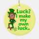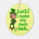 This angry leprechaun has no interest in luck. He makes his own luck. So don't expect him to be grinning and jigging under some sparkly rainbow. He's got his fist up, ready to fight. He has a sneer on his lips and a pipe in his mouth. And he also has whimsical rainbow stockings and little pointy shoes, but forget that -- he's tough! The text says, "Luck? I make my own luck." If you like boxing Irish leprechauns and you're a self-made and strong-willed person, this design would be a funny way to wear the green for Saint Patrick's Day.