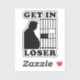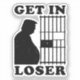 Anti Trump vinyl sticker for political humour fans. For real Americans who love democracy. Black graphic of a portly and corrupt Donald J Trump going to prison for all his crimes. "Get in loser". A grunge-style political sticker with humour and advocacy for justice. Perfect for dorm room windows, car windows, activists, voters, or sarcastic friends who love edgy and funny political gifts.