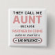 “They Call Me Aunt Because Partner In Crime Makes Me Sound Like A Bad Influence.” The stacked fonts and soft colors create a playful mood that fits fun aunts, nieces, nephews, and anyone who jokes about being the family troublemaker. This wording helps reach shoppers looking for funny aunt quotes, partner in crime humor, and lighthearted family sayings.