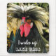 Liven up your computer work space with this vertically oriented mouse pad featuring the photo image of a funny looking rooster chicken with bad hair along with meme that reads, "I Woke Up Like This."