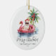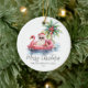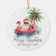 Get into the holiday spirit with this unique Christmas ornament featuring a relaxed Santa Claus in sunglasses lounging in a pink flamingo floaty in the ocean. Perfect for adding a beachy vibe to your Christmas tree, this ornament is ideal for those who live in tropical places like Florida, Hawaii, or the Bahamas, or for anyone who loves a fun, coastal holiday theme. The scene includes a palm tree decorated with ornaments, gentle ocean waves, and a small island behind Santa, all captured in a charming rustic watercolor style. The mix of simple fonts and script typography adds a casual yet elegant feel, while the date is displayed at the bottom to mark the occasion. A fun and festive way to bring some surf and sand into your holiday décor! Funny Beach Christmas Ceramic Ornament With Summer Santa In A Flamingo Floaty Palm Tree Ocean