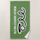 Funny beach towel gift for golf enthusiast. World's Okayest Golfer. Personalised towel for golfing fan, team, friends, mum, dad, coach, kids, husband, wife, coworker, colleague, company boss etc. Cool Birthday gift idea for him or her. Also nice for pool party or summer vacation. Letters can be spaced out evenly. Add your own name or humourous quote. Green or custom background colour. Cute design with ball and putt hole.