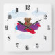 Funny bear flying by plane square wall clock