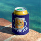 This funny beer foam can cooler design has a grinning cartoon mug with the words "Beer Me." It's a funny design for any beer lover. The customisable background is blue. The design repeats on both sides.