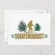 The design features a giant brown Sasquatch lumbering through a forest of tall green evergreen trees.