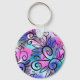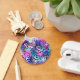 A funny little bird in the upper left corner and floral elements on a pink, purple and turquoise background.