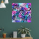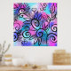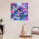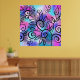 A funny little bird in the upper left corner and floral elements on a pink, purple and turquoise background.