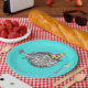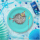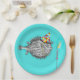 Creative birthday party plates for fisherman featuring funny fish blowing out birthday candle, making a wish.