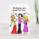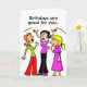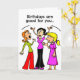 A funny birthday card featuring a woman telling her friends that birthdays make you live longer.