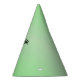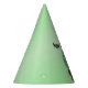 This paper party hat is green with with a funny man with a big green pickle for a head with a surprised looking face wearing a brown suit. Customise the Happy Birthday text with the template.