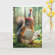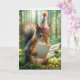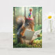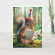 A squirrel stands in a sunlit forest, wearing a festive party hat while holding a birthday card.