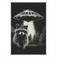 Add some quirky charm to your life with this fun and imaginative design! This artwork features an adorable racoon caught in the spotlight of a UFO’s beam, set against a starry night sky and a forest backdrop. Whether you're a fan of cute critters or fascinated by the mysteries of outer space, this whimsical scene blends both worlds in a lighthearted way. Perfect for gifts, home decor, or apparel, it’s sure to bring a smile to anyone who enjoys a touch of the unexpected and the delightfully strange!