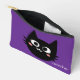 Funny purple toiletry bag featuring a comical cartoon black cat with big round eyes and rosy pink cheeks in a doodle drawing art style. A template in white text is placed in the bottom right corner on the front of the bag to add your name or delete the tet to leave blank.