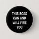 Show your fun side with this Funny Boss Humour button. It is designed with a funny saying, "this boss can and will fire you" in bold white simple lettering on black background. Perfect small gift idea for boss's day.