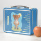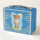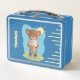 A funny metal lunch for elementary school kids featuring a brown bear eating an giant ice cream cone on a hot summer day . Personalise it with the child's name .
