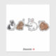 four distinct rabbit breeds on a clean white background. In a humorous twist, a calm white rabbit stands in the center holding a knife in its mouth. To its left, a Dutch rabbit (black and white) and a Lop-eared rabbit (brown) look on with surprise, marked by exclamation points. To its right, a small brown Netherland Dwarf rabbit is depicted with a wide-eyed, terrified expression. This piece captures a surreal, comedic moment with vibrant colors and expressive character design.