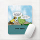 This funny geocaching personalised mousepad or mouse mat design has a cartoon with a geocacher reaching and saying, "It should be behind this bush. I'll be the FTF. Woo-hoo!"