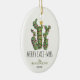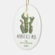 Funny christmas ornament featuring a cute cactus christmas tree wrapped in string lights, topped with a gold star, the humorous seasons greetings 'MERRY CACT-MUS', your family name, and the year.