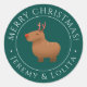 Send these funny capybara reindeer Christmas Round Stickers with a holiday gift to your friend, family member, or loved one. The green sticker design features a capybara illustration in the centre with personalised 'Merry Christmas and name' perfect for capybara lovers. The capybara illustration is hand-drawn original artwork by artbybiyan.