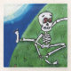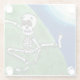 This glass drink coaster has a funny cartoon type skeleton with red and yellow goofy eyes dancing in a grassy field under a white hazy moon and deep blue night sky.