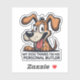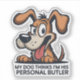 This funny cartoon dog design features a playful brown pup with big expressive eyes and a mischievous smile, paired with the bold quote “My dog thinks I’m his personal butler.” The vibrant colors and energetic illustration capture a humorous pet-owner moment, making it perfect for dog lovers who enjoy quirky humor and bold cartoon style.