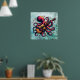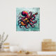 Funny cartoon comic book style octopus playing a guitar ai art. Turquoise abstract background.